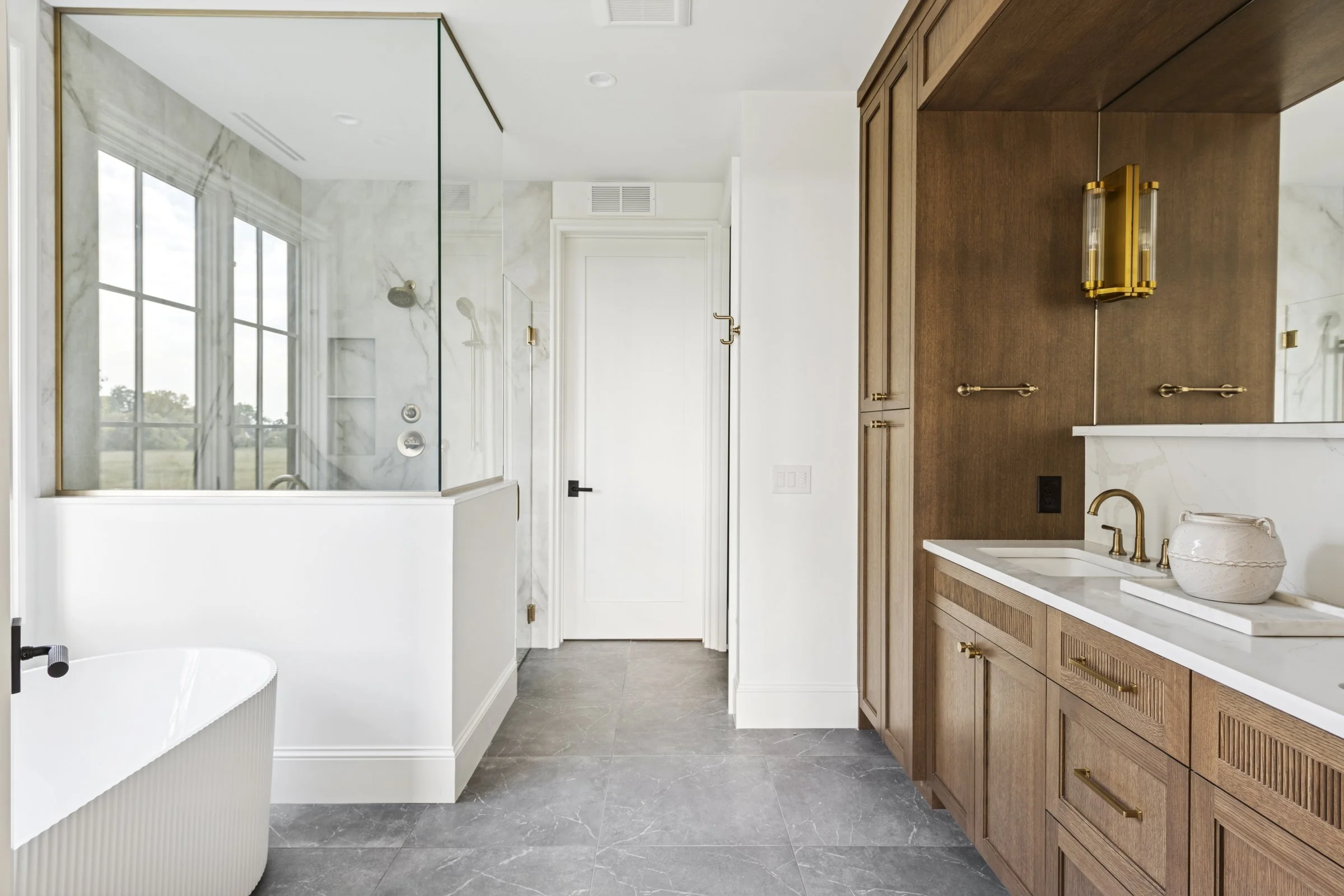 Heated tile floors, white oak or enameled cabinetry, and natural stone counters complement a deep soaking tub and frameless glass shower.