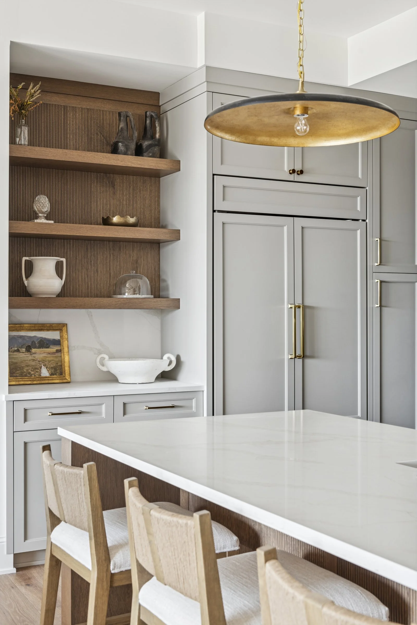 White oak or enameled cabinetry, natural stone surfaces, and detailed millwork complement high-performance Wolf and Sub-Zero appliances, with Kohler and Brizzo fixtures completing the space.
